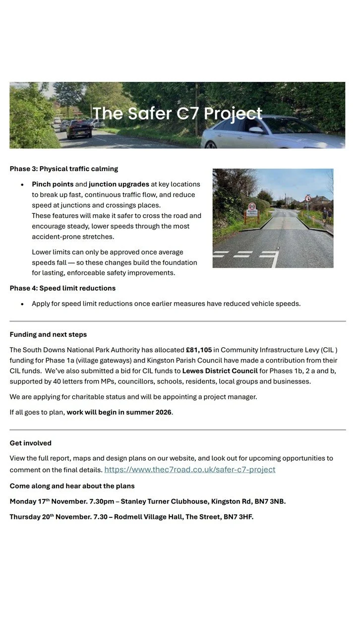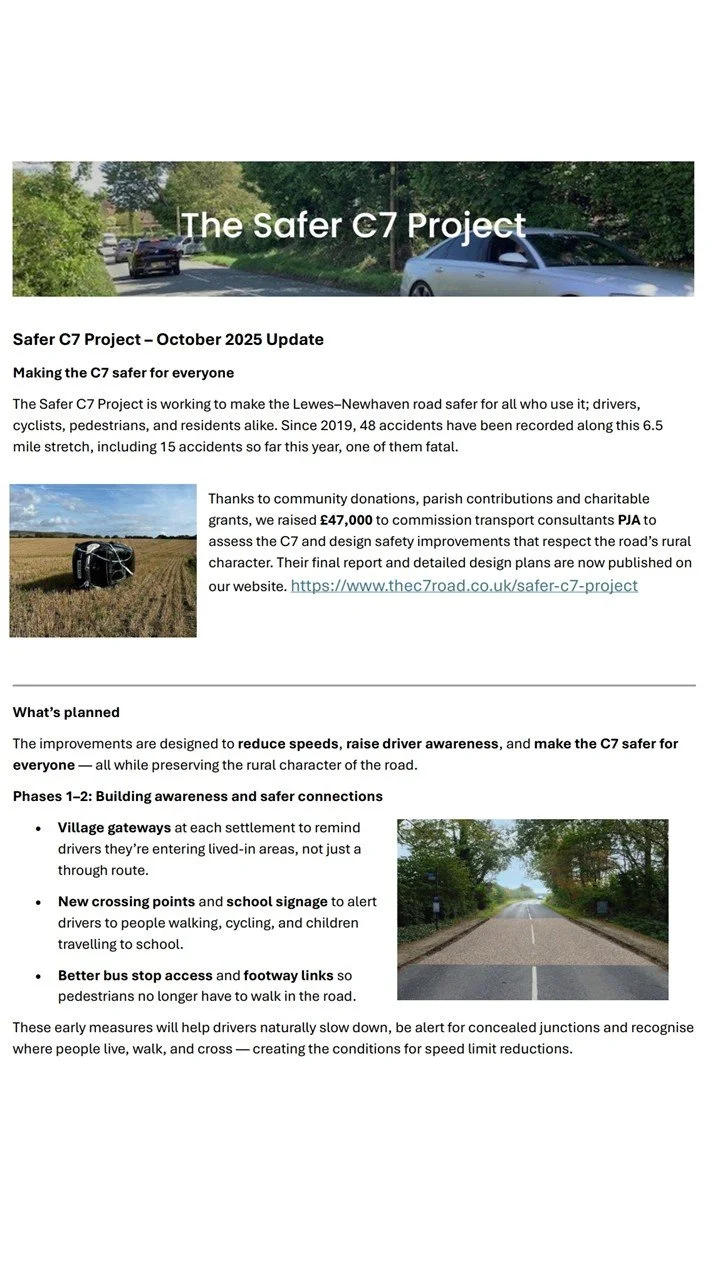 The recent serious accident near Southease (January 2025) has highlighted yet again the need for safety improvements on the C7. The Safer C7 Project raised the funds needed to commission Philip Jones Associates (PJA) to produce a detailed and costed design plan to reduce speed and improve safety on the C7. Public consultations on their draft proposals, were held in July, and the draft plans have been published on the Safer C7 Project website. Since then, the proposals have been refined and there have been some preliminary discussions with ESCC and the South Downs National Park. The measures are being prioritised for a phased implementation. Outline CAD designs and associated costings are currently being produced.